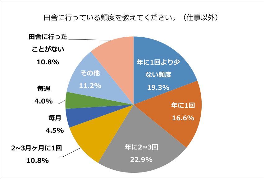 また、「田舎に行っている頻度」を尋ねたところ、「年に2〜3回」22.9%と最多となりました。冬休みや夏休み、ゴールデンウィークなどの大型連休で訪れていることが予測できます。