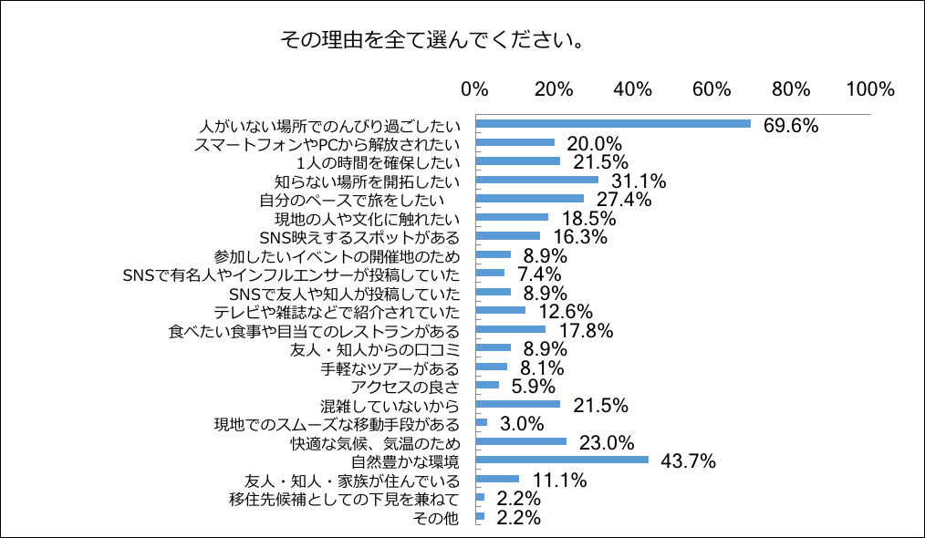 調査の結果、20代女性の7割以上が田舎に魅力を感じていました。観光地ではなくあえて田舎を選ぶ理由としては、「人がいない場所でのんびり過ごしたい」が4割以上と圧倒的に多く、「自然豊かな環境」や「自分のペースで旅をしたい」、「混雑していないから」、「1人の時間を確保したい」などの声も多く挙げられたことから、都会暮らしや観光地では味わえない、非日常感を田舎に求めている傾向があることがわかりました。