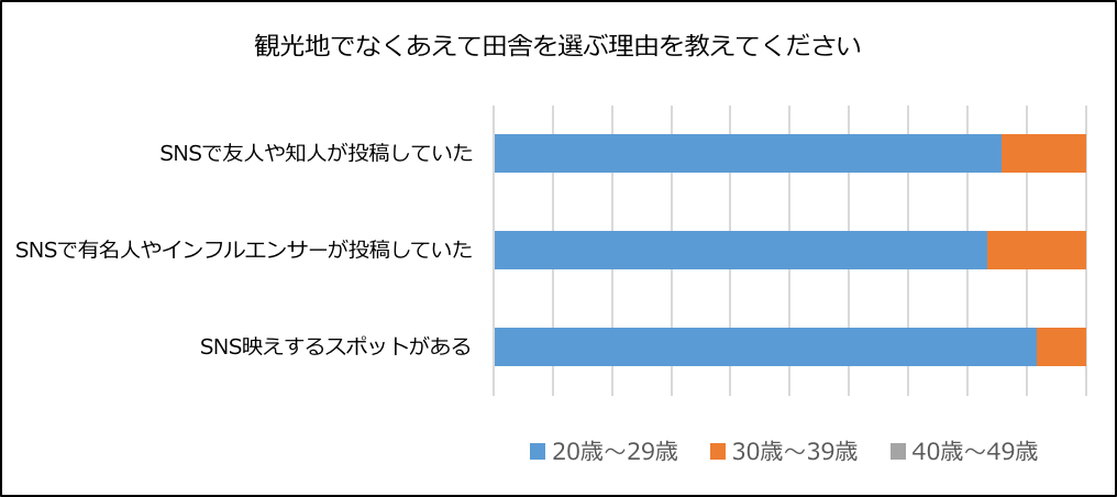 田舎旅行の理由として「SNS映えするスポットがあるから」「SNSで有名人やインフルエンサーが投稿していた」「SNSで友人や知人が投稿していた」を選んだ人の比率が他の年代より高い。