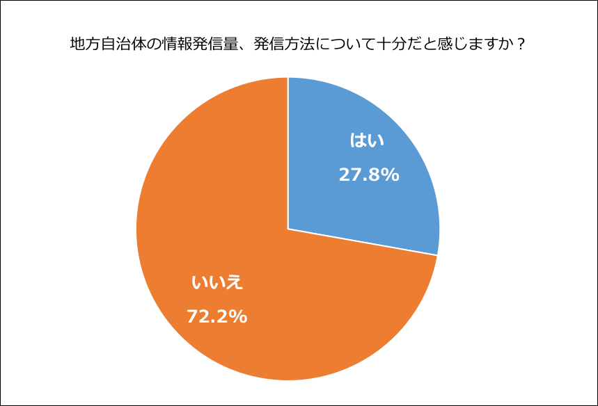 「地方自治体の情報発信量、発信方法について十分だと感じるか」を尋ねたところ、「いいえ」と回答した人が7割以上(72.2%)でした。