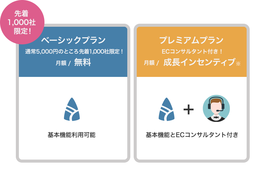 ご利用いただけるプランとして「ベーシックプラン」と、ECコンサルタントによるサポートを受けることができる「プレミアムプラン」があります。「ベーシックプラン」は月額利用料 5,000円のところを先着1,000社限定にて無料で提供します。「プレミアムプラン」は前年同月比における売上金額増加分の10%が利用料金として発生します。また、両プランとも広告運用などの一部機能は有料で提供しており、これらをご利用いただくことでEC店舗運営のさらなるサポートが可能です。