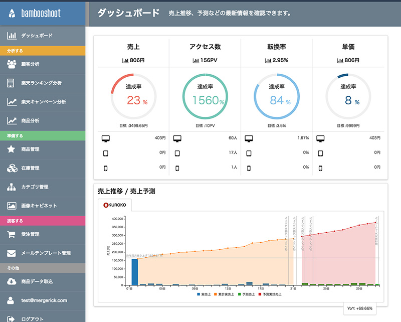 『bambooshoot(バンブーシュート)』は、ネットショップ運営に必要な「分析」「準備」「接客」などの全機能を搭載し、楽天市場やYahooショッピングとの連携で、モール間を超えた複数ネットショップの同時運営を可能にするネットショップ運営支援ツールです。最大の特徴は、ユーザー店舗のデータをもとに AI が購買傾向 や最適な販売対象(ターゲットセグメント)を自動抽出するだけでなく、大手モールのランキングなど広範に取得しているオープンデータをもとに売上向上施策を収集・分析・評価する点です。