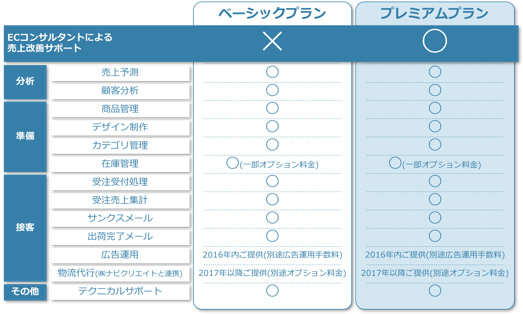 ・ 利用料:「ベーシックプラン」と、EC コンサルタントによ るサポートを受けることができる「プレミアムプラン」がある。「プレミアムプラン」は前年同月比における売上金額増加分の10%が利用料金として発生。